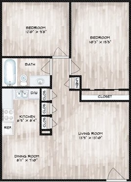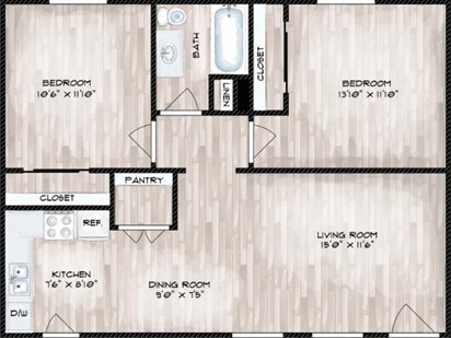 Modelo de apartamento: 2 bedroomDesde $6652 Dormitorios, 1 Baño, 720-744 sq ftDisponible Ahora![]()