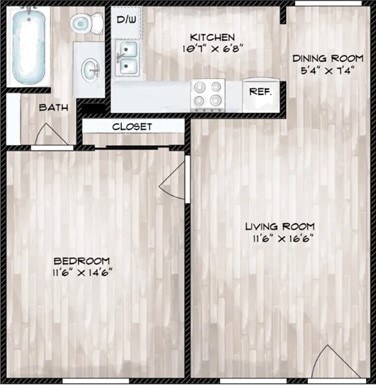 Modelo de apartamento: 1 bedroomDesde $5991 Dormitorio, 1 Baño, 520-627 sq ftDisponible Ahora![]()