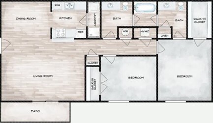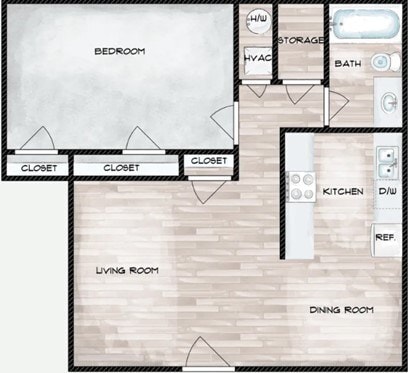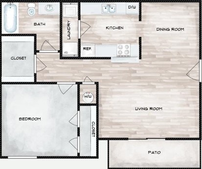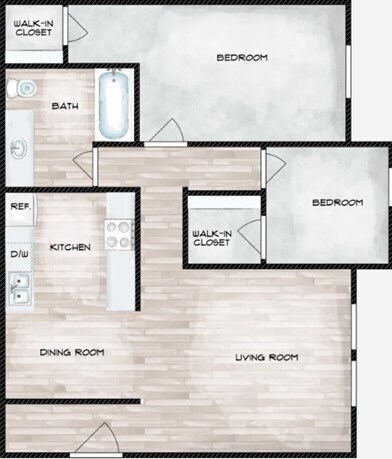 Modelo de apartamento: 2 Bed, 1 BathDesde $7152 Dormitorios, 1 Baño, 753 sq ftDisponible Ahora![]()