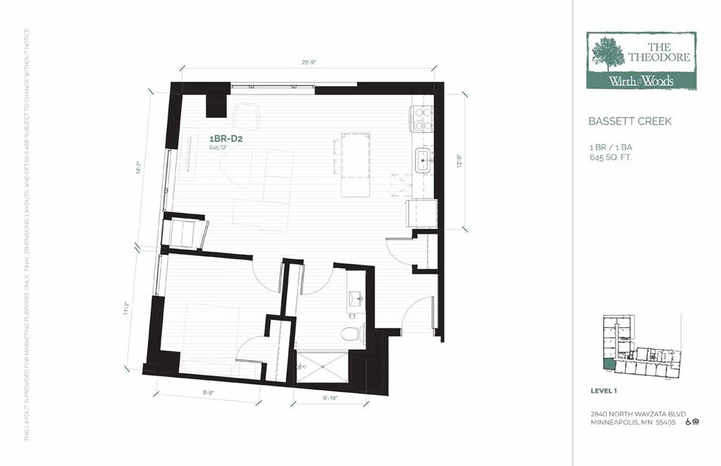 1 Dormitorio, 1 Baño, 644 pies²Galería del Modelo