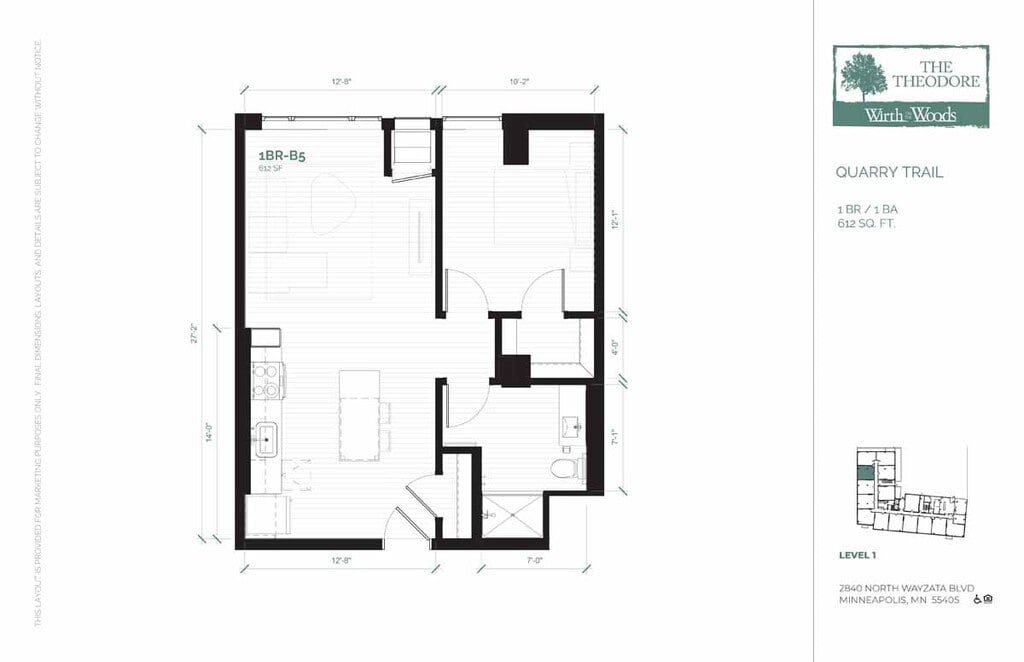 1 Dormitorio, 1 Baño, 612 pies²Galería del Modelo