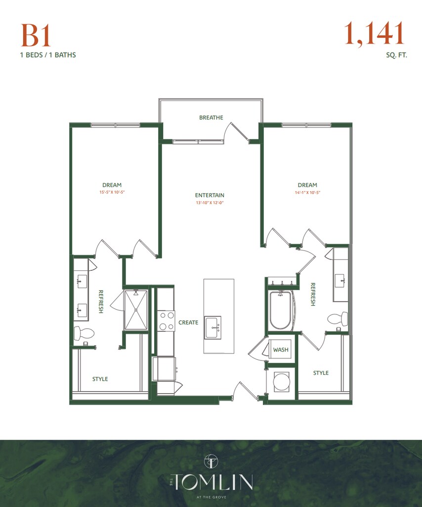1 Dormitorio, 1 Baño, 1036 pies²Disponible AhoraGalería del Modelo