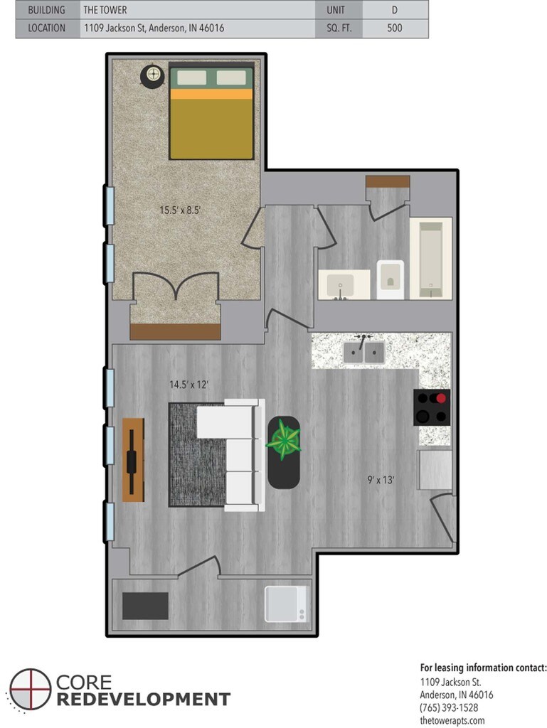 Unidad de apartamento: 1204Modelo de apartamento: 1BR/1.0BA1 Dormitorio, 1 Baño, 500 sq ftDisponible Ahora