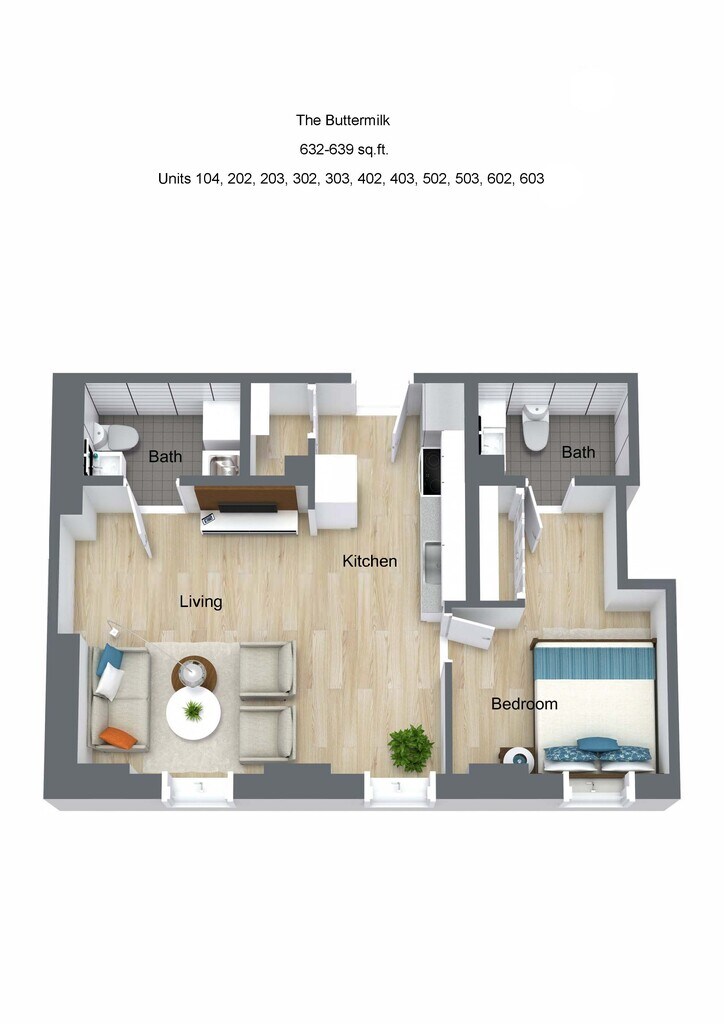 The Buttermilk - Plano 5 Unidad de apartamento: 602Modelo de apartamento: The Buttermilk$1,5051 Dormitorio, 1.5 Baños, 639 sq ftDisponible December 12, 2025The Belle Isle