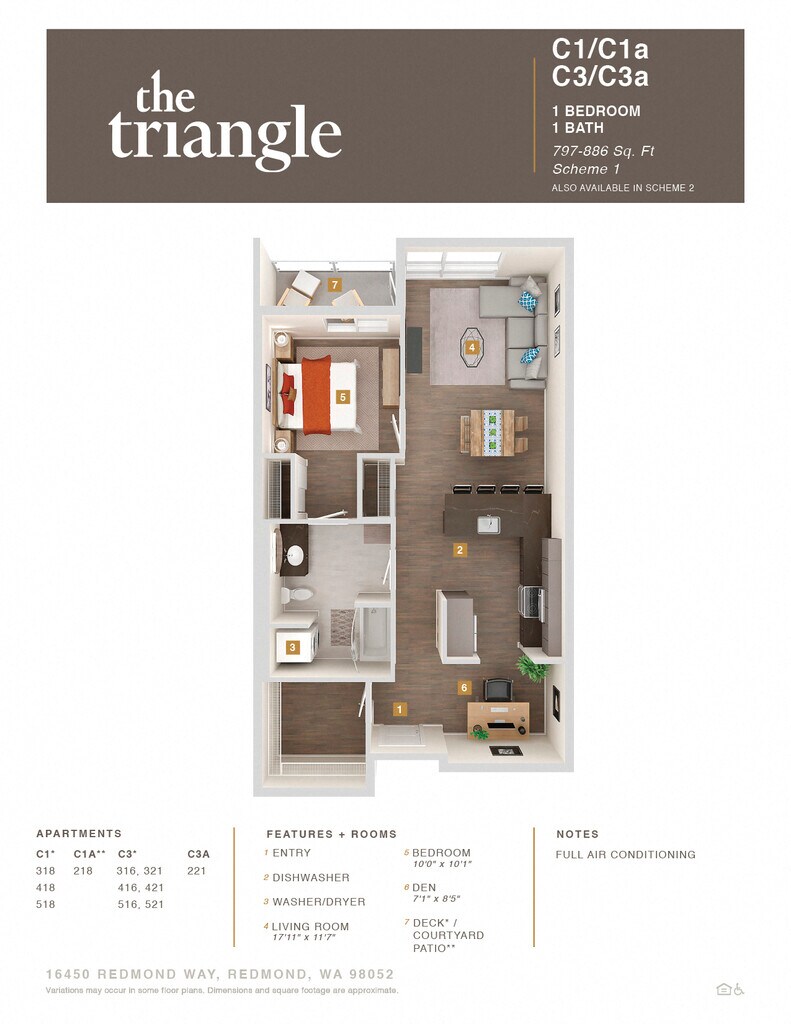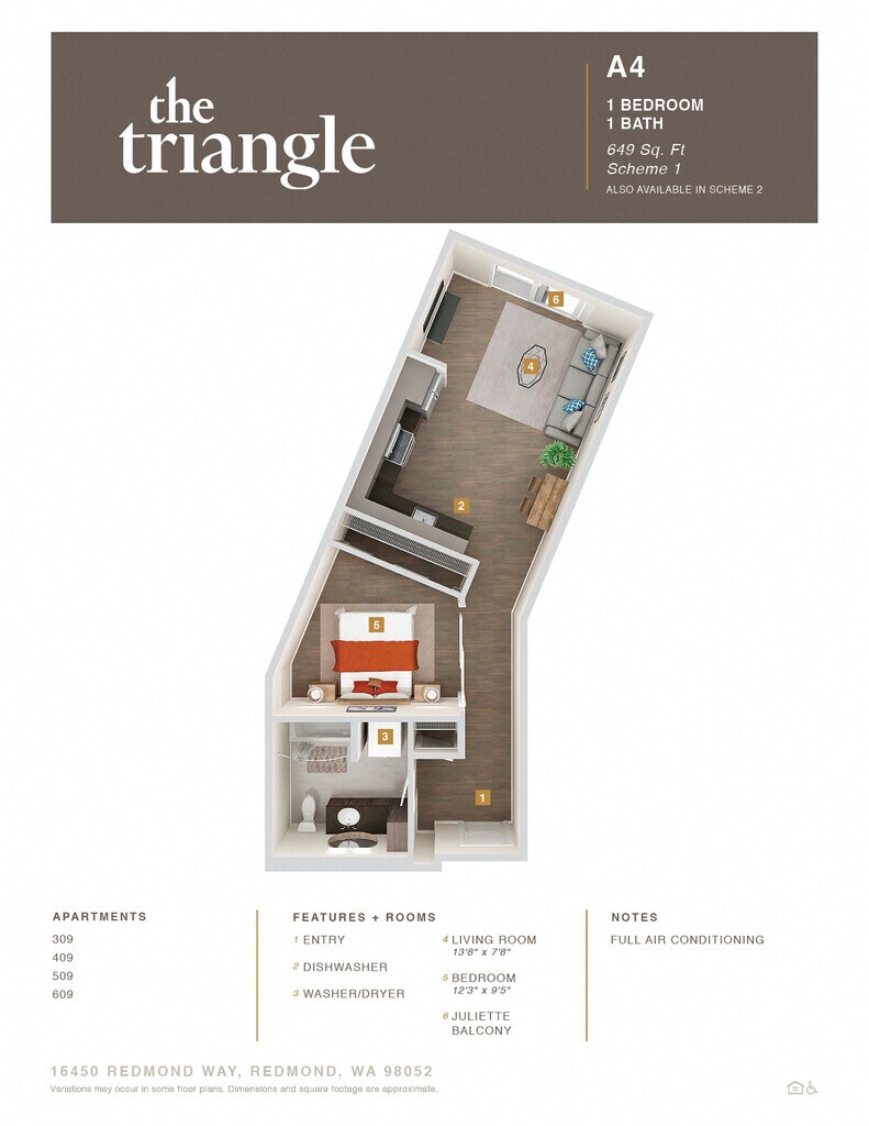 The Triangle se encuentra en el Barrio Downtown Redmond y el código postal 98052 de Redmond, WA. Esta comunidad está gestionada profesionalmente por Legacy Partners Residential
