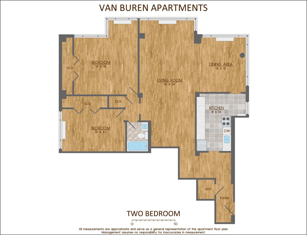 Modelo de apartamento: Small 2Bdrm-1Bath-Tier4+72 Dormitorios, 1 Baño, 1100 sq ftNo DisponibleSmall 2Bdrm-1Bath-Tier4+7 - Plano 1 Lge Bdrm-1Bath-Tier 1+10