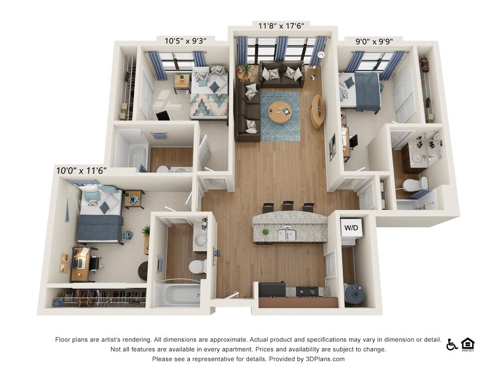 Modelo de apartamento: 3 Bedroom - 3 Bath (3C)$1,2753 Dormitorios, 3 Baños, 1107 sq ftDisponible AhoraLos planos de la planta son una interpretación artística. Todas las dimensiones son aproximadas. Los tamaños o el detalle del producto real y sus especificaciones pueden variar. No todas las características están disponibles en todos los hogares para rentar. Los precios y la disponibilidad están sujetos a cambios. El alquiler que se muestra es mensual. Se pueden aplicar ciertos cargos, por ejemplo, entrega de paquetes, recolección de basura, agua, servicios, etc. Depositos varian. Consulta a un representante para conocer detalles.