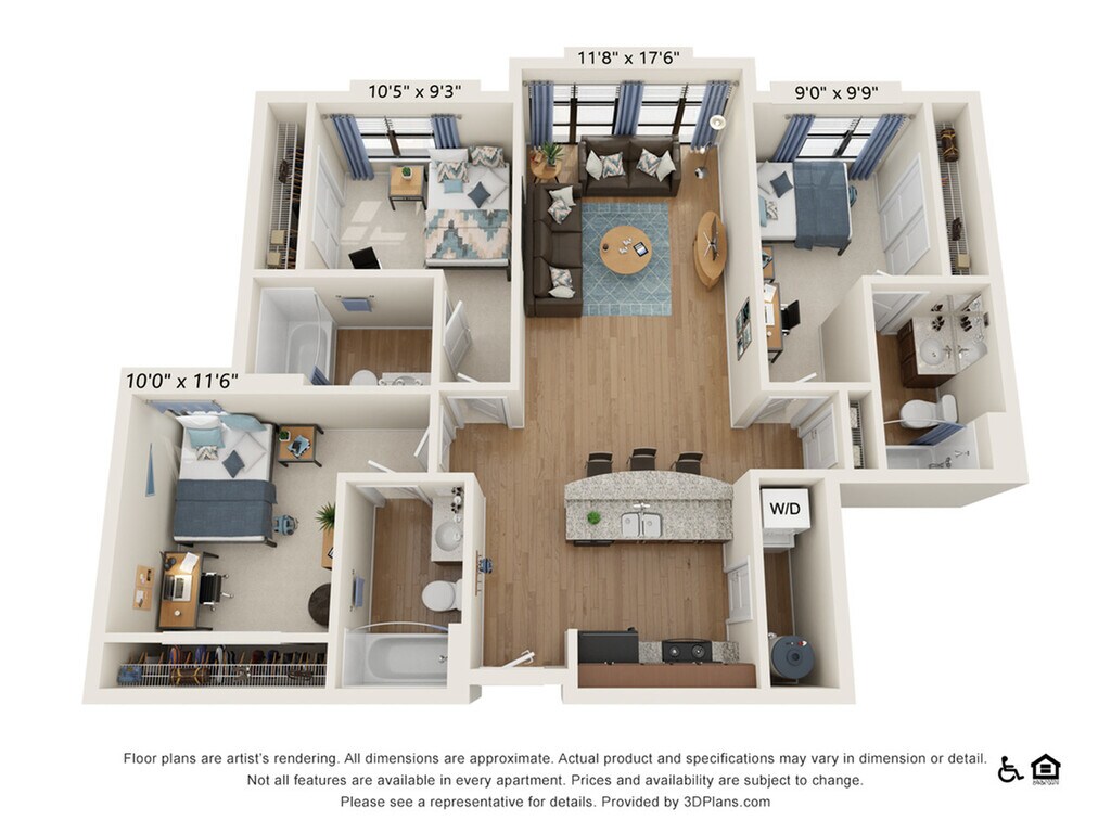 3 Bedroom - 3 Bath (3D) - Plano 1 Los planos de la planta son una interpretación artística. Todas las dimensiones son aproximadas. Los tamaños o el detalle del producto real y sus especificaciones pueden variar. No todas las características están disponibles en todos los hogares para rentar. Los precios y la disponibilidad están sujetos a cambios. El alquiler que se muestra es mensual. Se pueden aplicar ciertos cargos, por ejemplo, entrega de paquetes, recolección de basura, agua, servicios, etc. Depositos varian. Consulta a un representante para conocer detalles.