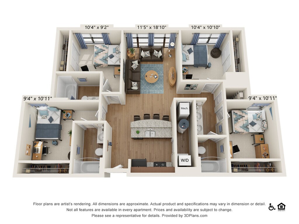 Modelo de apartamento: 4 Bedroom - 4 Bath (4B)$1,2254 Dormitorios, 4 Baños, 1559 sq ftDisponible AhoraLos planos de la planta son una interpretación artística. Todas las dimensiones son aproximadas. Los tamaños o el detalle del producto real y sus especificaciones pueden variar. No todas las características están disponibles en todos los hogares para rentar. Los precios y la disponibilidad están sujetos a cambios. El alquiler que se muestra es mensual. Se pueden aplicar ciertos cargos, por ejemplo, entrega de paquetes, recolección de basura, agua, servicios, etc. Depositos varian. Consulta a un representante para conocer detalles.