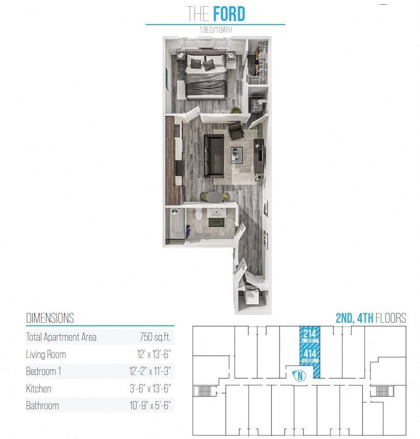 Modelo de apartamento: Ford (1 Bedroom Jr.)$1,7001 Dormitorio, 1 Baño, 750 sq ftDisponible Ahora![]()