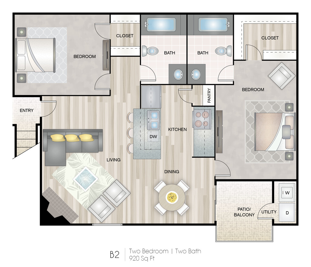 2 Dormitorios, 2 Baños, 920 pies²Disponible AhoraGalería del Modelo