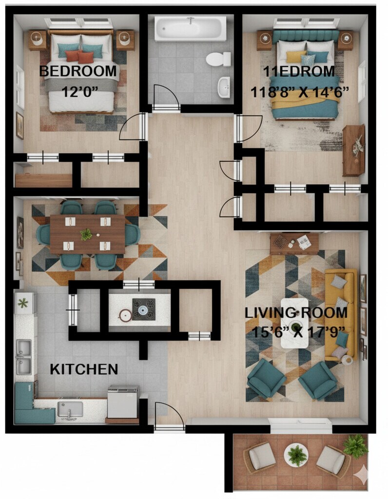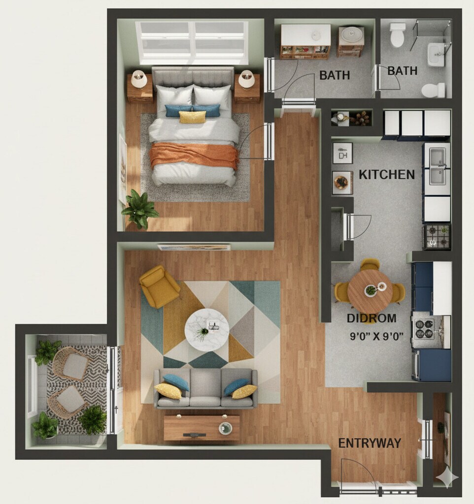 1 Dormitorio, 1 Baño, 750 pies²Disponible AhoraGalería del Modelo