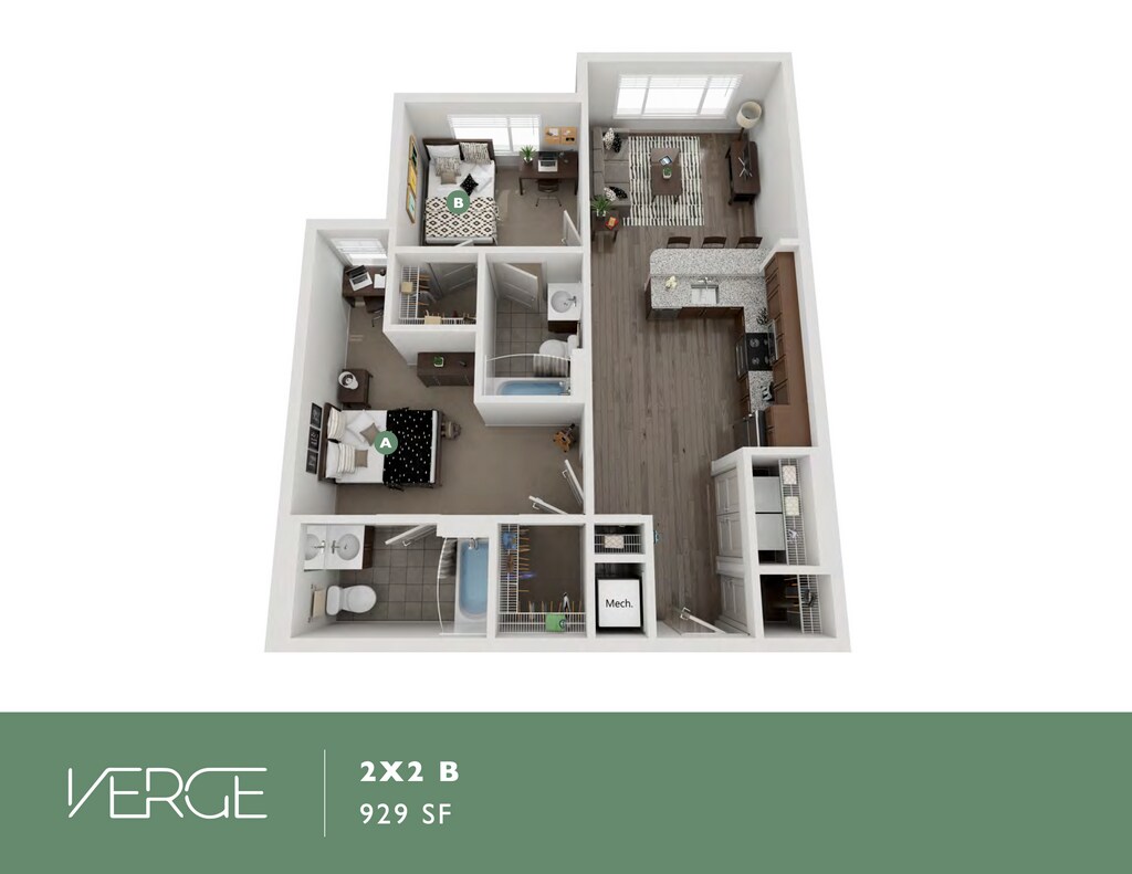 2 Dormitorios, 2 Baños, 804-929 pies²Disponible AhoraGalería del Modelo