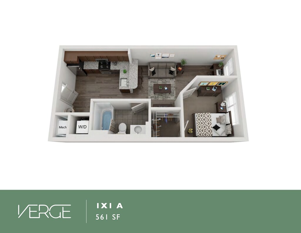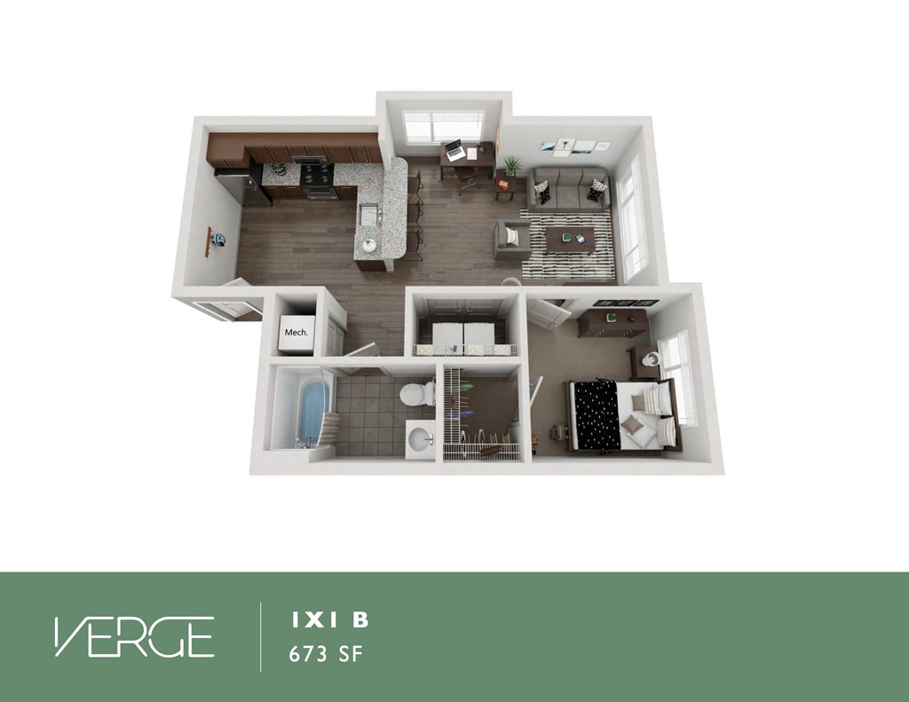 1 Dormitorio, 1 Baño, 561-673 pies²Disponible August 20, 2026Galería del Modelo