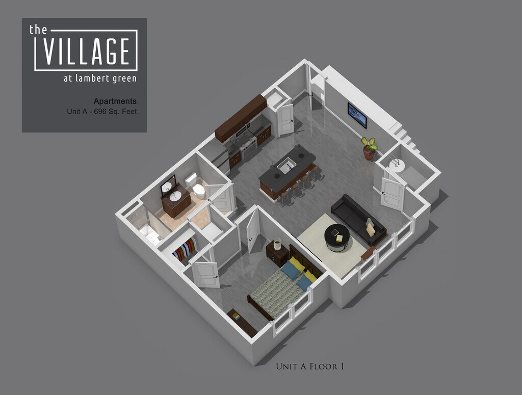 Modelo de apartamento: 1 Bedroom/1 Bath1 Dormitorio, 1 Baño, 696 sq ftDisponible December 1, 2025PlanosFotos![]()