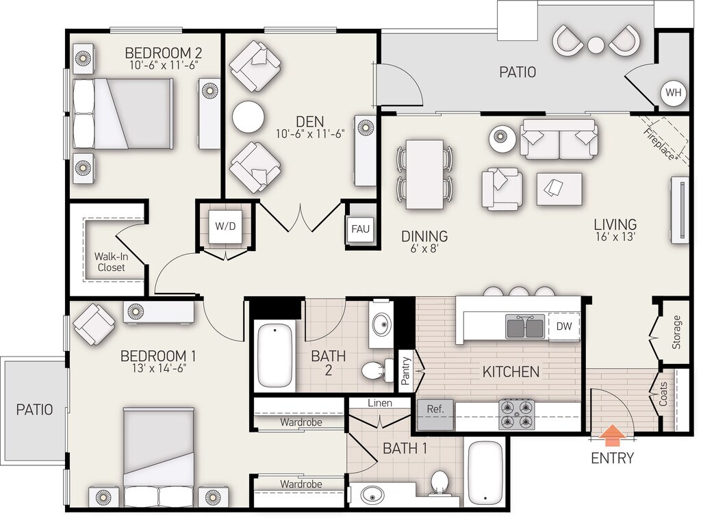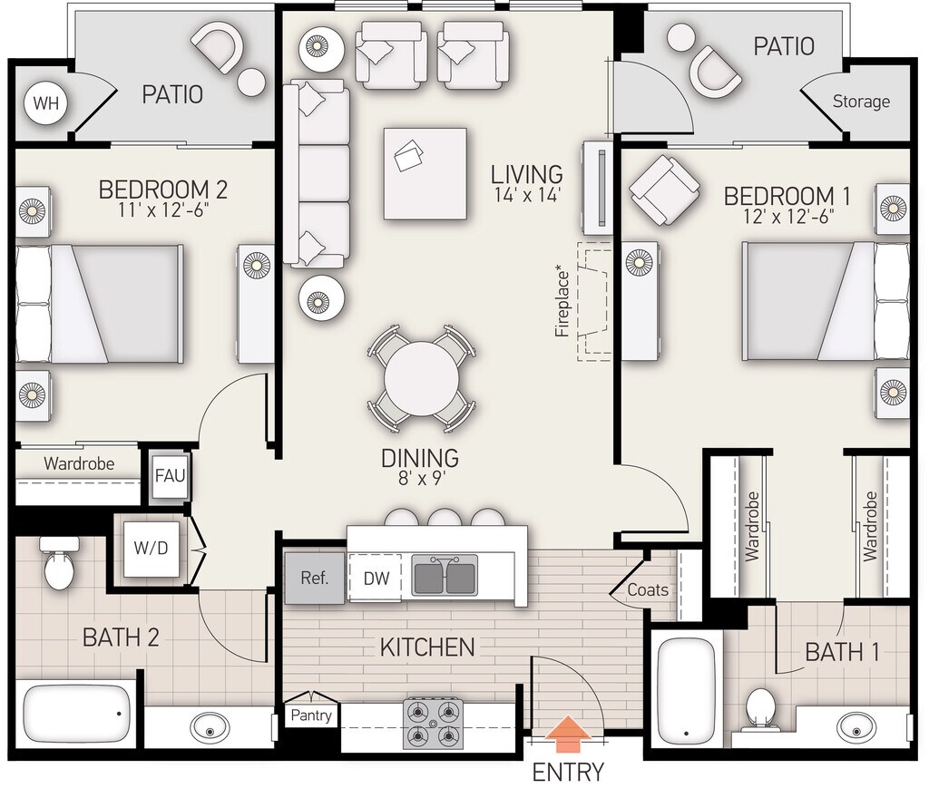 Modelo de apartamento: Plan DDesde $5,4652 Dormitorios, 2 Baños, 1109 sq ftDisponible Ahora![]()