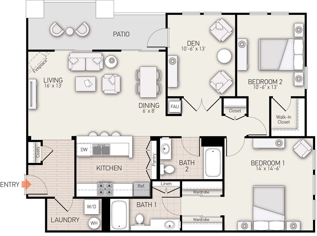 Modelo de apartamento: Plan BDesde $4,4101 Dormitorio, 1 Baño, 778 sq ftDisponible Ahora![]()