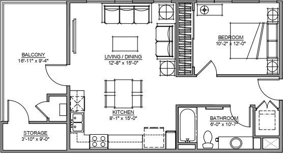 Modelo de apartamento: AspenLlame para Precios1 Dormitorio, 1 Baño, 644 sq ftNo Disponible![]()