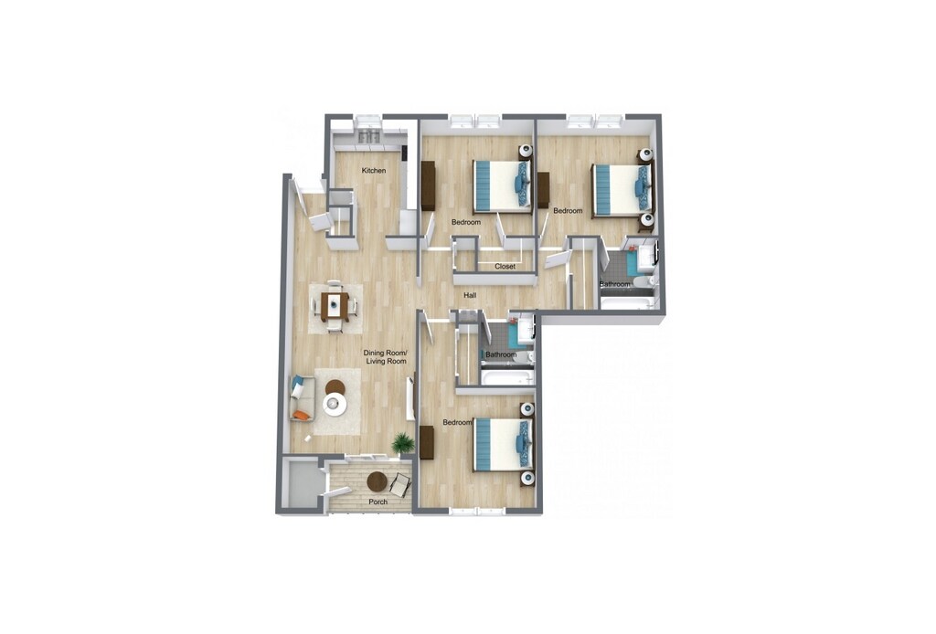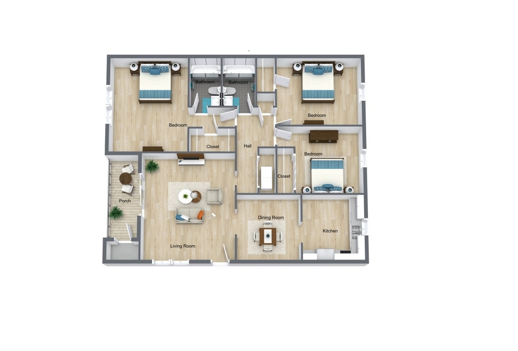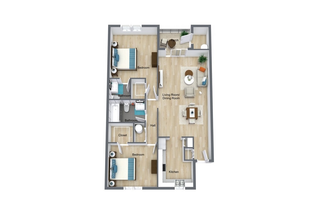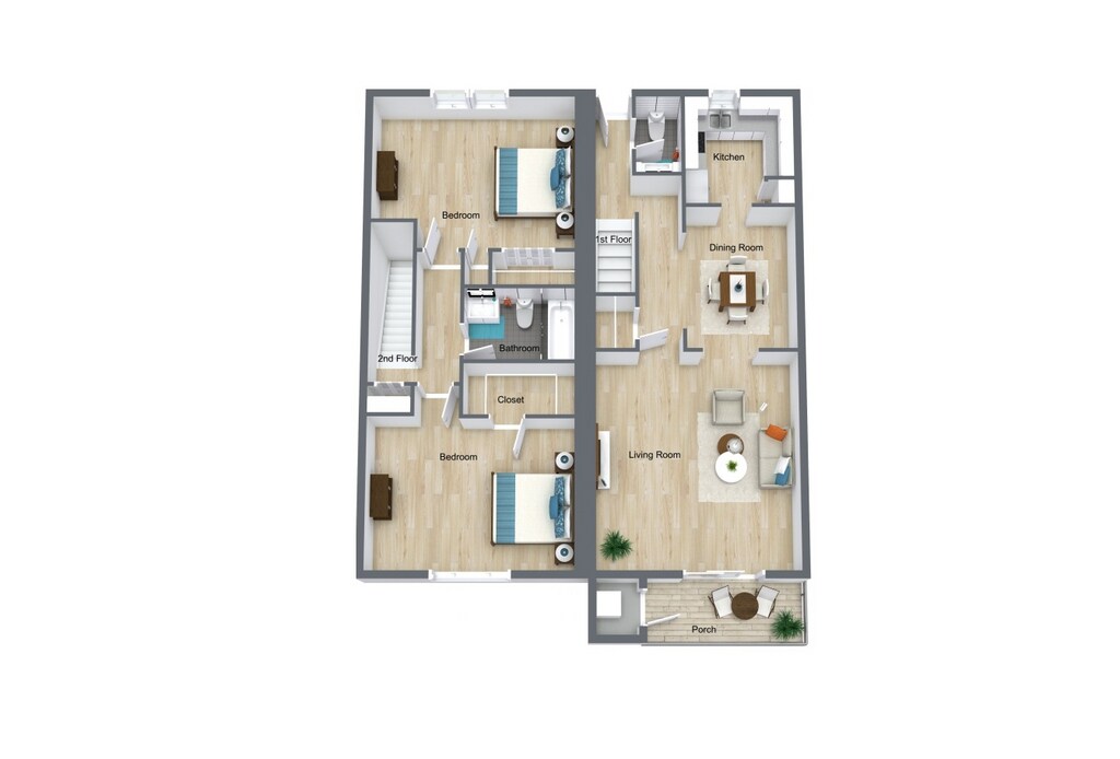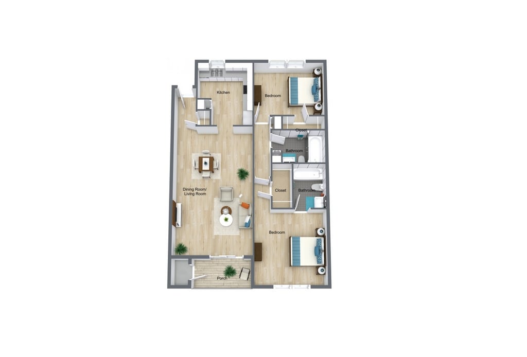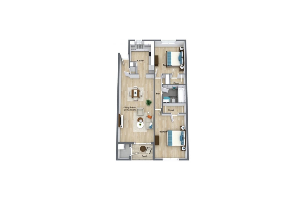2 Dormitorios, 1 Baño, 1000 pies²Disponible AhoraGalería del Modelo