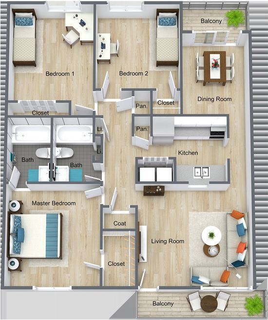 3 Dormitorios, 2 Baños, 1200 pies²Disponible AhoraGalería del Modelo
