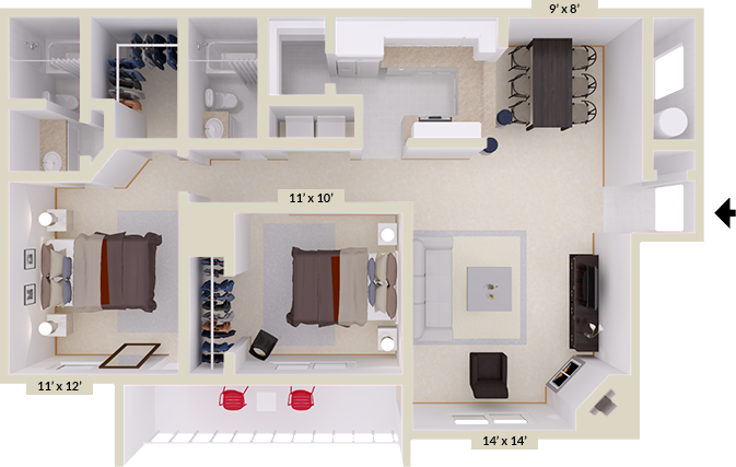 Modelo de apartamento: Bradford PearDesde $1,3992 Dormitorios, 2 Baños, 1078 sq ftDisponible Ahora![]()