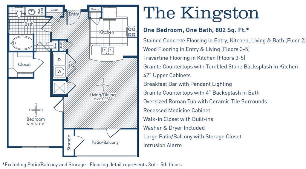 Modelo de apartamento: The KingstonDesde $1,6261 Dormitorio, 1 Baño, 802 sq ftDisponible AhoraLos planos de la planta son una interpretación artística. Todas las dimensiones son aproximadas. Los tamaños o el detalle del producto real y sus especificaciones pueden variar. No todas las características están disponibles en todos los hogares para rentar. Los precios y la disponibilidad están sujetos a cambios. El alquiler que se muestra es mensual. Se pueden aplicar ciertos cargos, por ejemplo, entrega de paquetes, recolección de basura, agua, servicios, etc. Depositos varian. Consulta a un representante para conocer detalles.