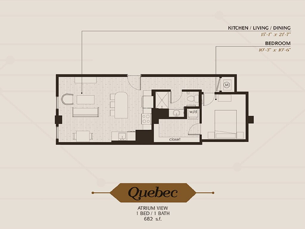 Modelo de apartamento: QuebecDesde $1,1501 Dormitorio, 1 Baño, 689 sq ftDisponible AhoraPlanosFotos![]()