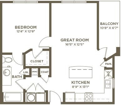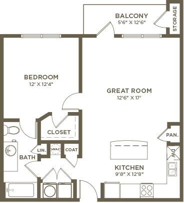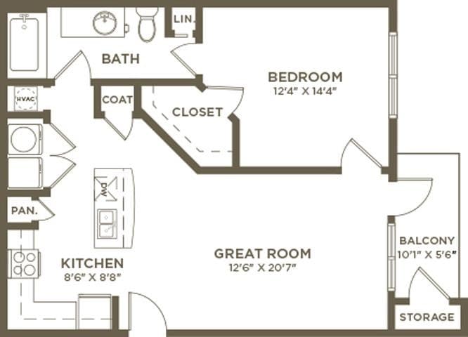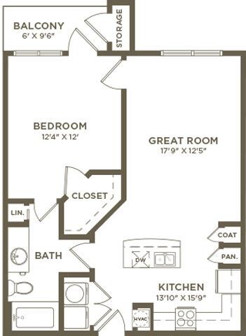 Modelo de apartamento: A0Desde $9041 Dormitorio, 1 Baño, 590 sq ftDisponible Ahora![]()