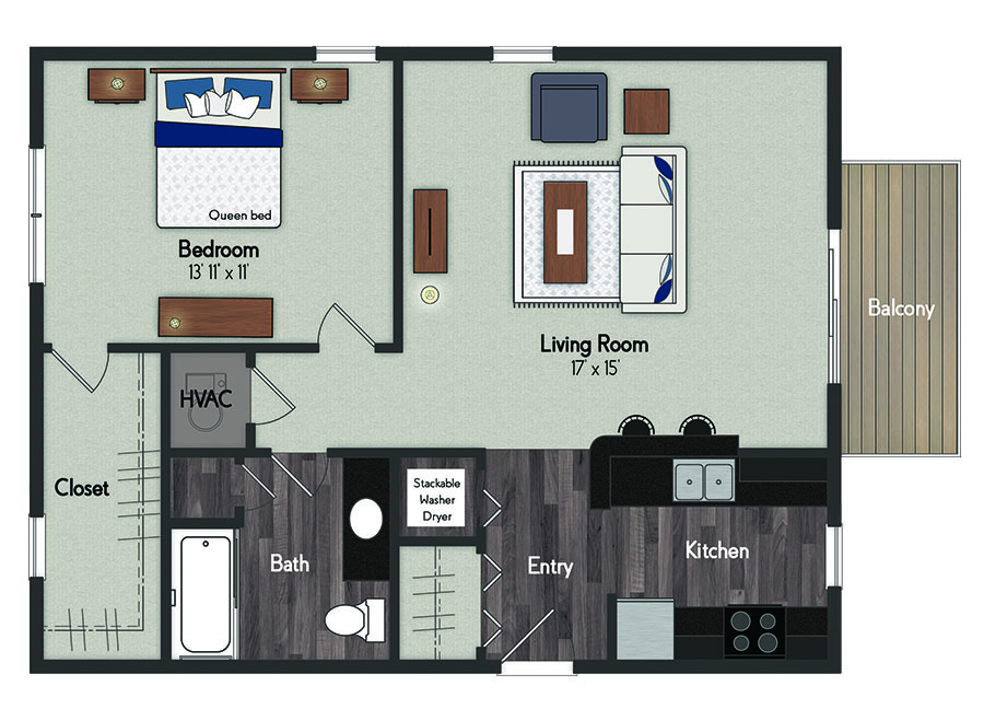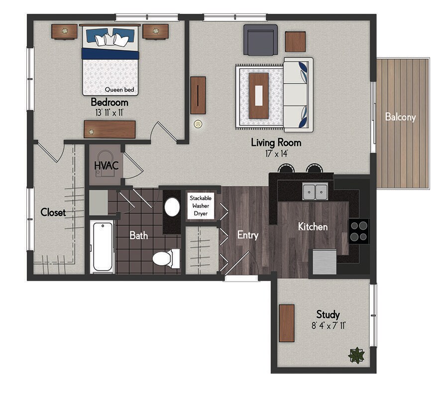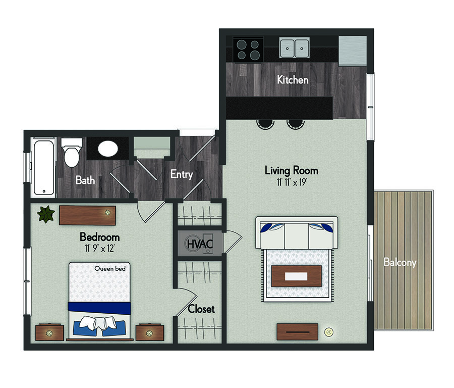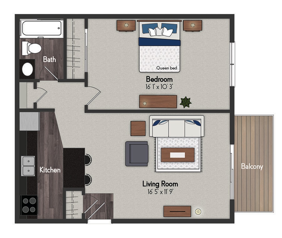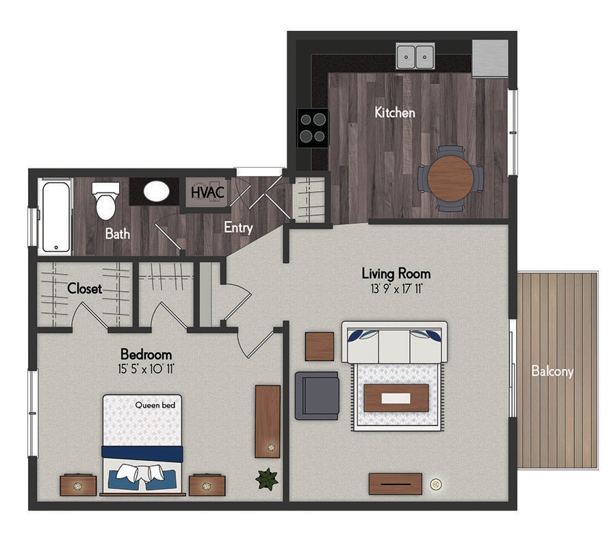 Modelo de apartamento: Alpine ADesde $9501 Dormitorio, 1 Baño, 550-610 sq ftDisponible Ahora![]()