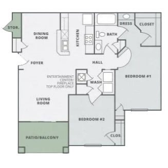 Modelo de apartamento: B1Desde $1,3652 Dormitorios, 1 Baño, 1026 sq ftDisponible Ahora![]()