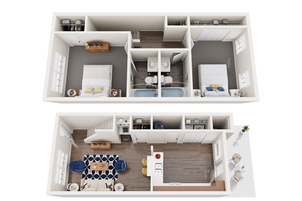Modelo de apartamento: 2B Townhome$1,2082 Dormitorios, 2 Baños, 1110 sq ftDisponible Ahora2B Townhome - Plano 1 2B Ranch