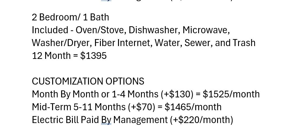Base Rent Includes - Refrigerator, Dishwasher, Microwave, Stove/Oven, Washer/Dryer, High Speed Fiber Internet, Water, Sewer, and Trash~~Great Value! We have highly customizable lease lengths as well as options to rent furniture or have the electric bill paid by management. Please call or click on links for more details.