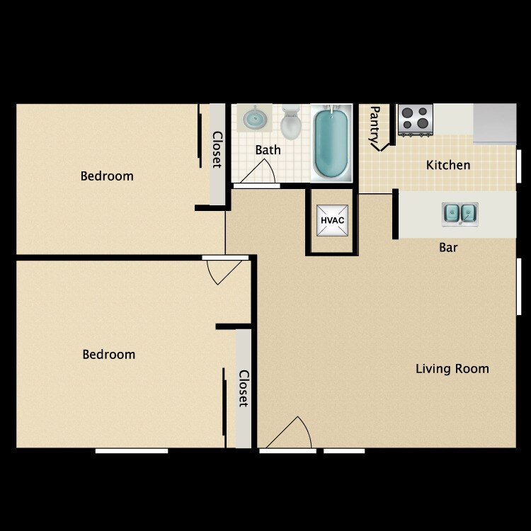 2 Dormitorios, 1 Baño, 710 pies²Galería del Modelo