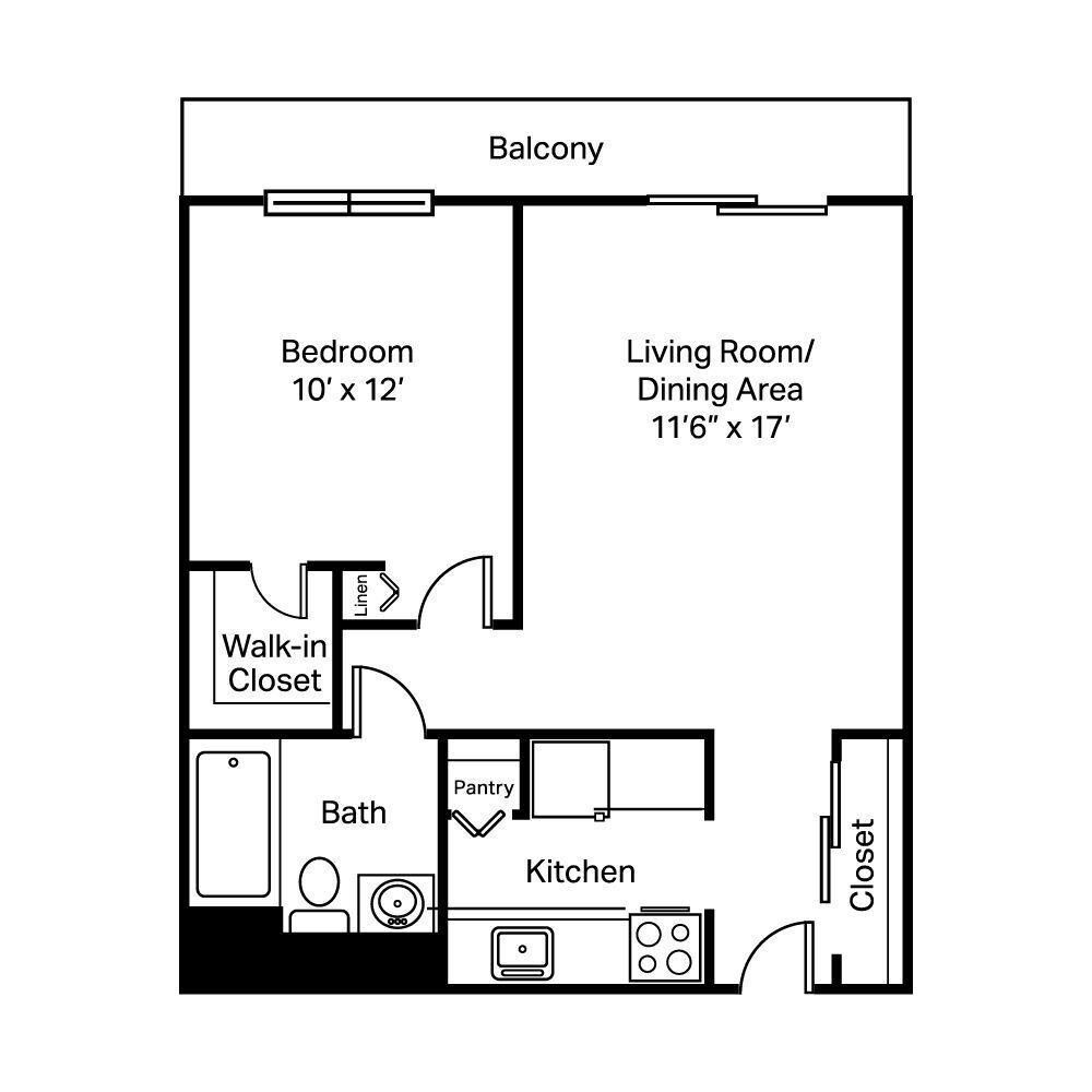 1 Dormitorio, 1 Baño, 570-585 pies²Disponible AhoraGalería del Modelo
