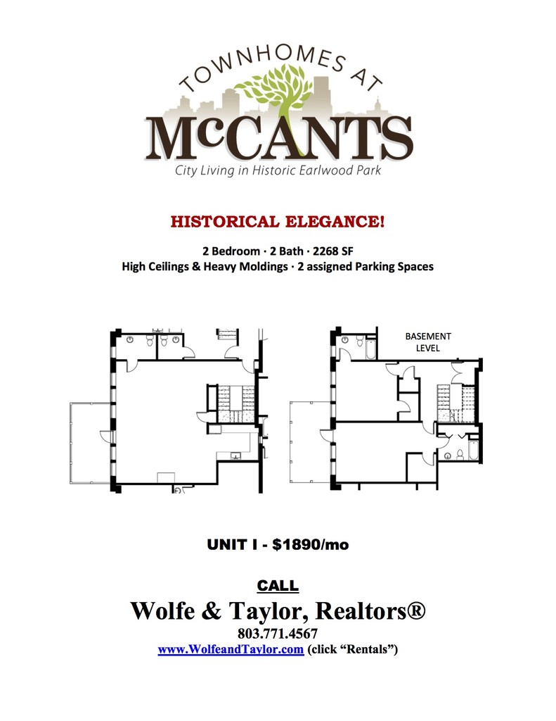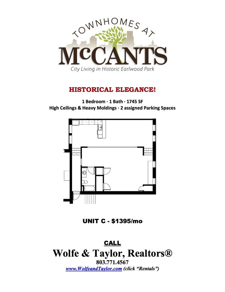 Brand New Townhomes at McCants - City Living in Historic Earlwood Park! HUGE Townhomes starting at $1,150 per month. One and two bedroom units available. Each unit has either a patio or a deck! Fully equipped kitchen and more! One month rent free! Pets allowed under 25 lbs. No appointment necessary! You can view this property by coming to our office to pick up a key. A refundable $10 cash deposit and photo ID are necessary to check out a key. We are located at 1216 Pickens Street, Columbia, SC 29201 and open Monday - Friday from 9:00 AM - 5:00 PM.