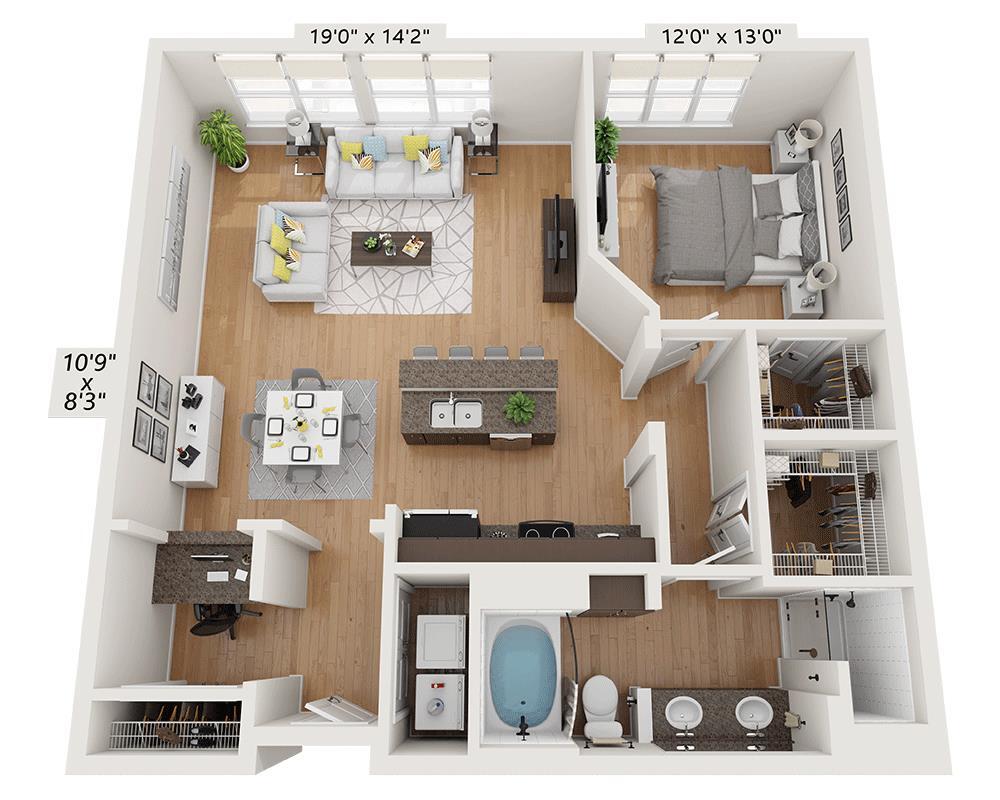 Modelo de apartamento: Plan D (A1D)Desde $1,9111 Dormitorio, 1 Baño, 1010 sq ftDisponible Ahora![]()