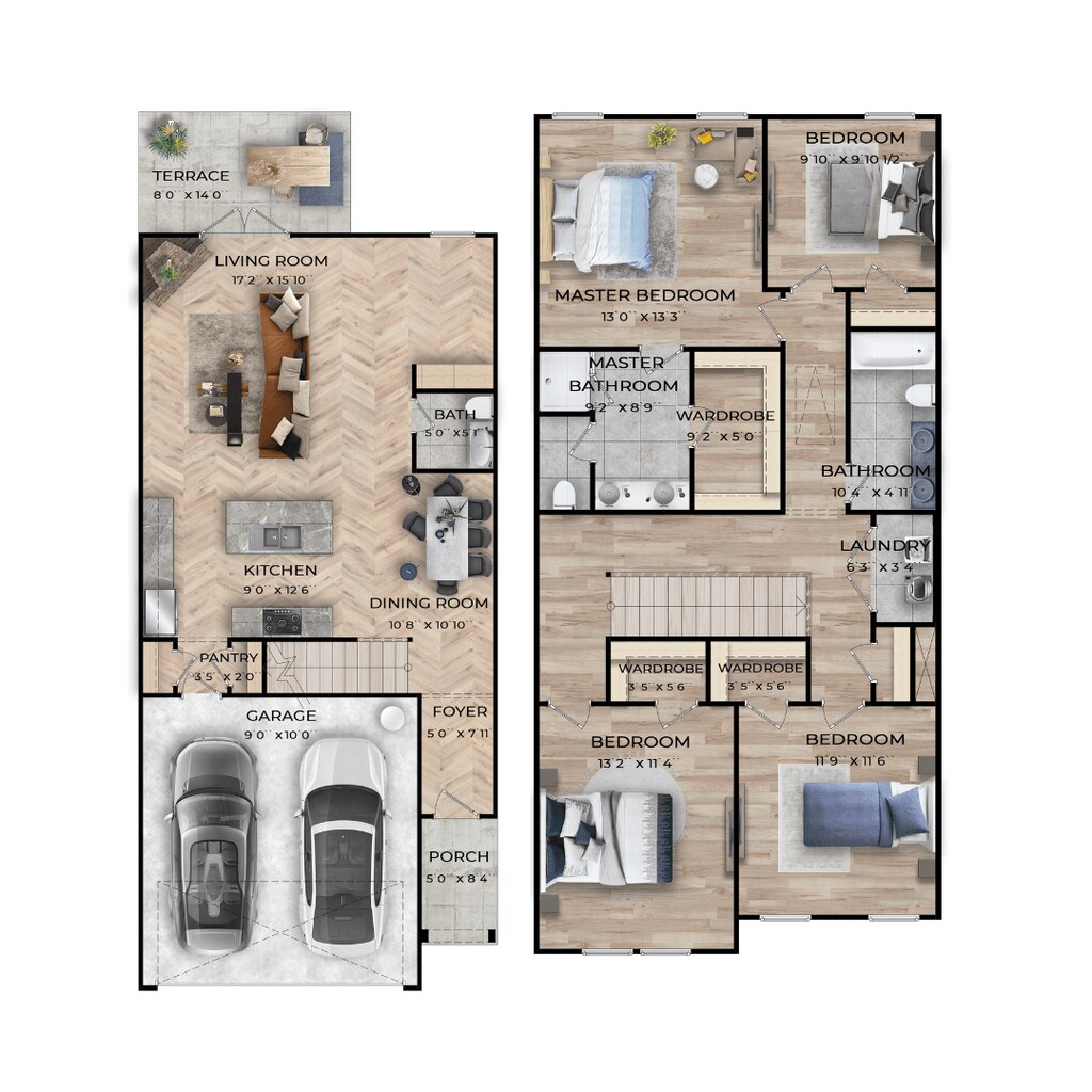 - Casas de 3 y 4 habitaciones con un promedio de 1,794 pies cuadrados