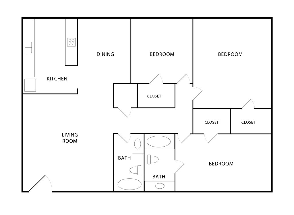 3 Dormitorios, 2 Baños, 1096 pies²Galería del Modelo