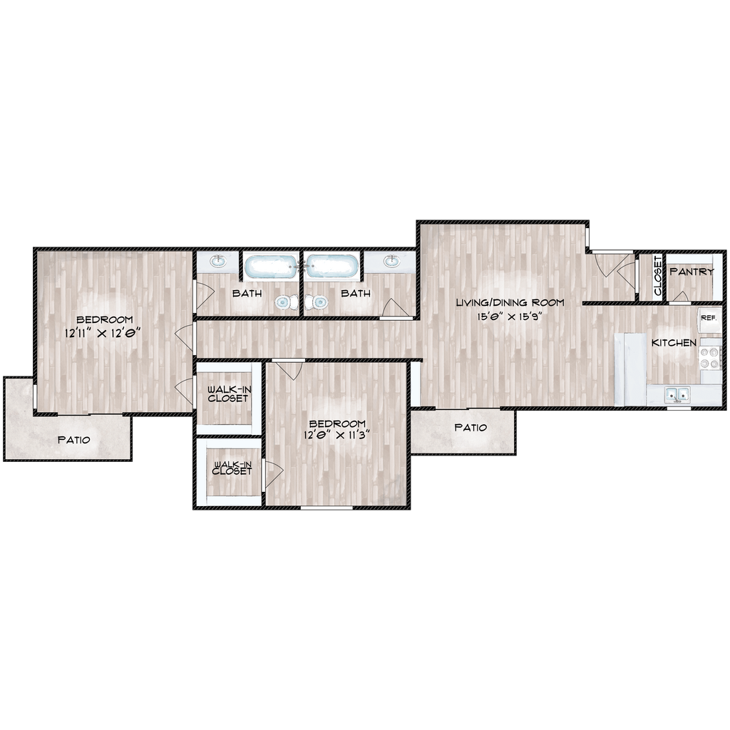 Modelo de apartamento: 2 Bed x 2 Bath2 Dormitorios, 2 Baños, 1121 sq ftDisponible Ahora![]()
