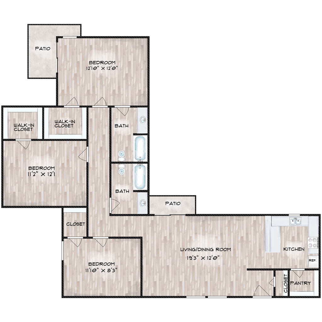 Modelo de apartamento: 3 Bed x 2 Bath3 Dormitorios, 2 Baños, 1251 sq ftDisponible Ahora![]()