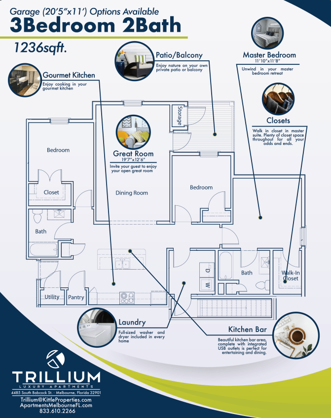Modelo de apartamento: Three Bedroom Apartment3 Dormitorios, 2 Baños, 1236-1275 sq ftDisponible Ahora![]()