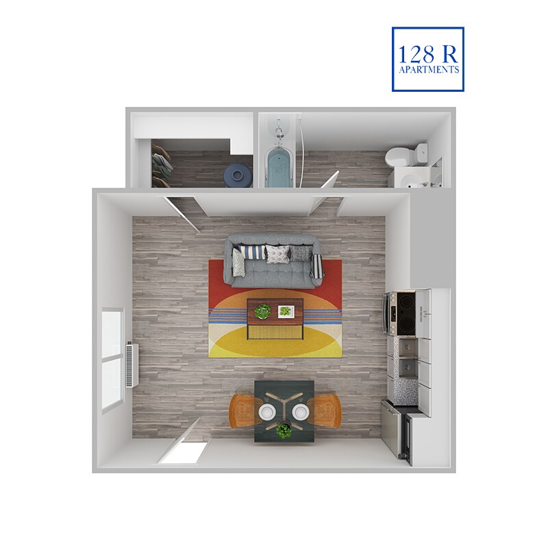 Modelo de apartamento: 128R A1$770Estudio, 1 Baño, 294 sq ftNo DisponibleLos planos son representaciones artísticas. Todas las dimensiones son aproximadas. El producto y las especificaciones reales pueden variar en tamaño o detalle. No todas las características están disponibles en cada vivienda en alquiler. Por favor, consulta con un representante para obtener más detalles.