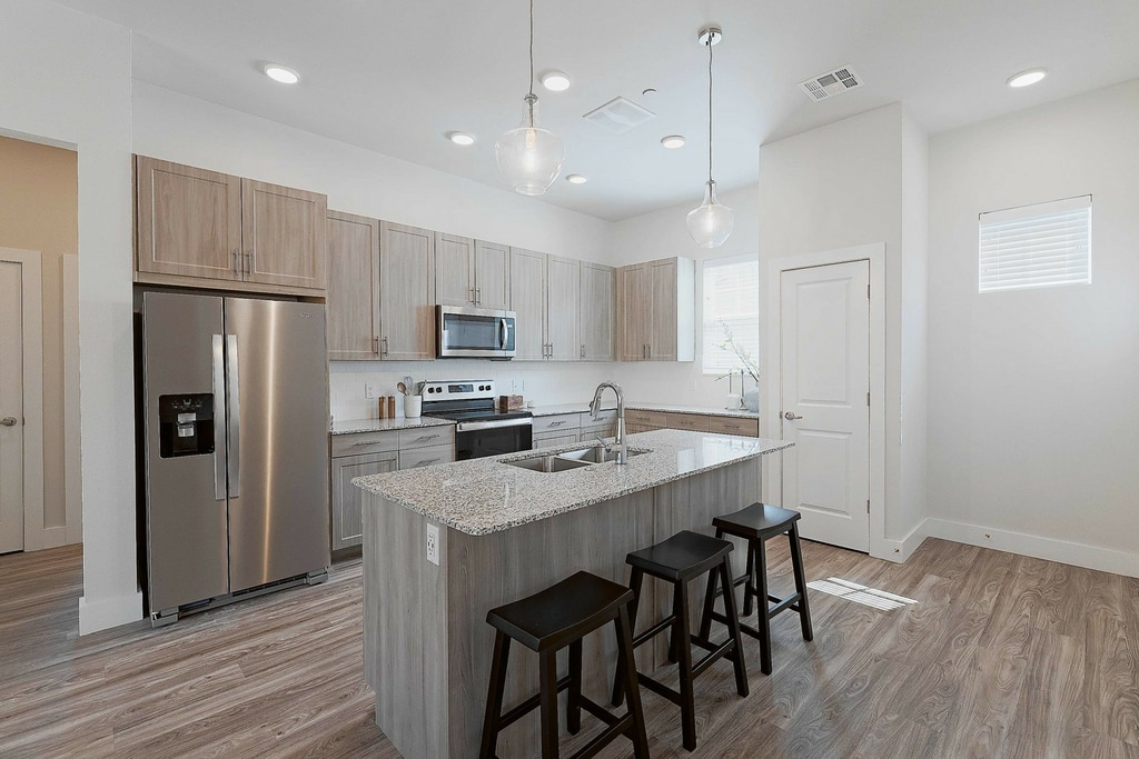 Twill Centennial Crossing ofrece todo el lujo y la privacidad de una lujosa casa unifamiliar con la comodidad de una vida sin necesidad de mantenimiento. Nuestras nuevas casas unifamiliares de una, dos y tres habitaciones cuentan con patios traseros privados cercados, techos de 10 pies, acabados de diseñador, cocinas gourmet con encimeras de granito y electrodomésticos de acero inoxidable, amplio espacio de almacenamiento y lavadoras y secadoras grandes.
