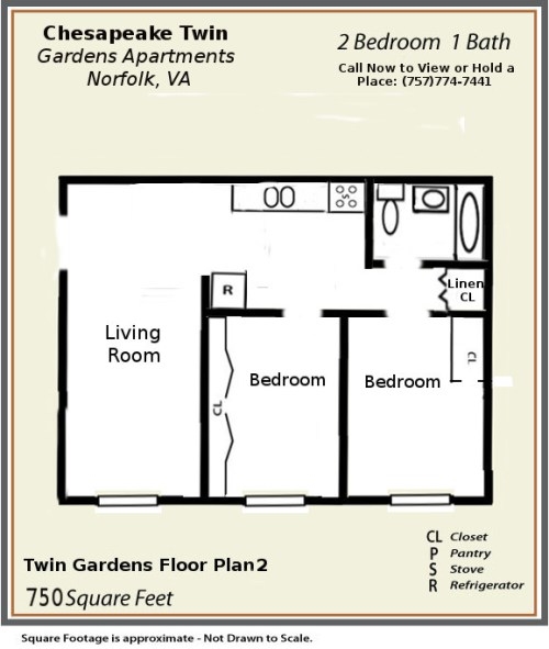 2 Dormitorios, 1 Baño, 750 pies²Galería del Modelo