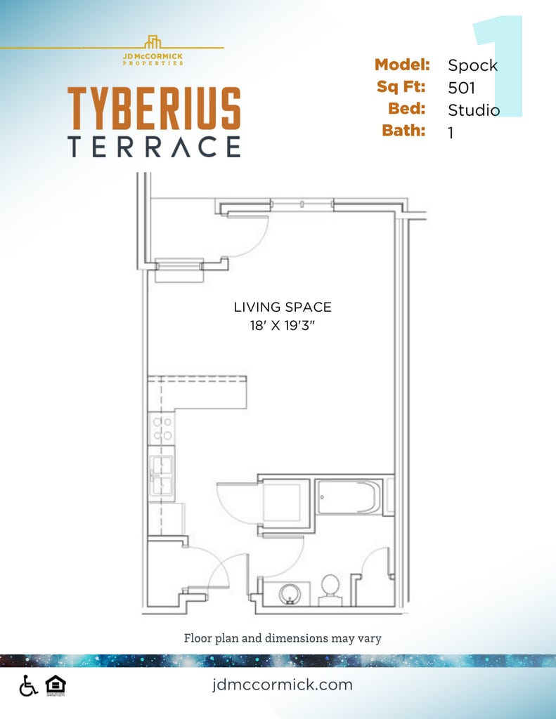 Modelo de apartamento: 5302 #208 - Spock$1,415Estudio, 1 Baño, 501 sq ftDisponible July 1, 2026PlanosFotos![]()