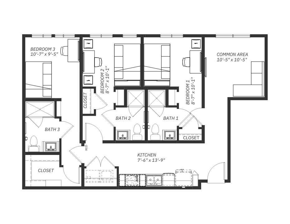 Modelo de apartamento: 3x3BDesde $9503 Dormitorios, 3 Baños, 1125 sq ftDisponible Ahora![]()