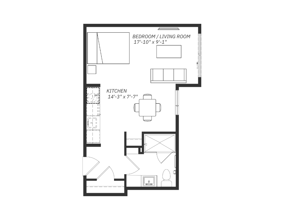 Estudio, 1 Baño, 445 pies²El más grandeEsta opción tiene las unidades más grandes para este modeloGalería del Modelo