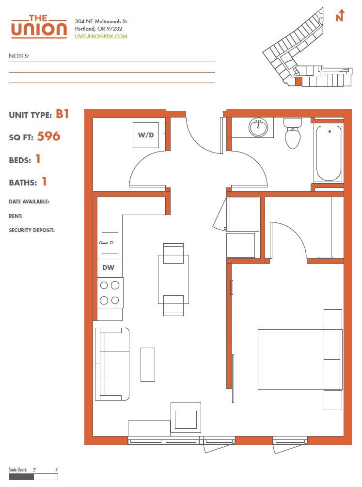 B1.3 - Plano 1 Unidad de apartamento: 327Modelo de apartamento: B1.3$1,3501 Dormitorio, 1 Baño, 596 sq ftDisponible AhoraPlano: B4