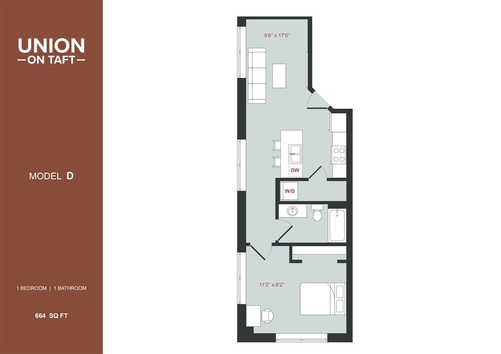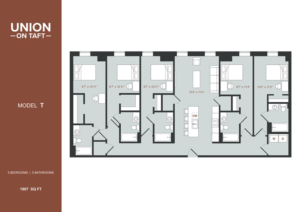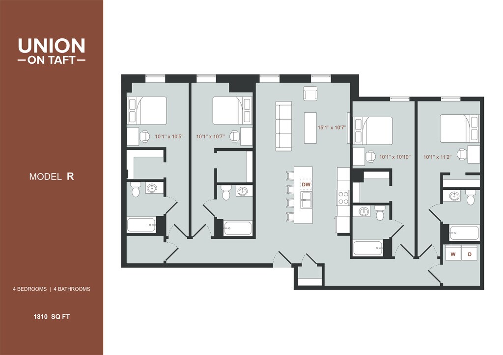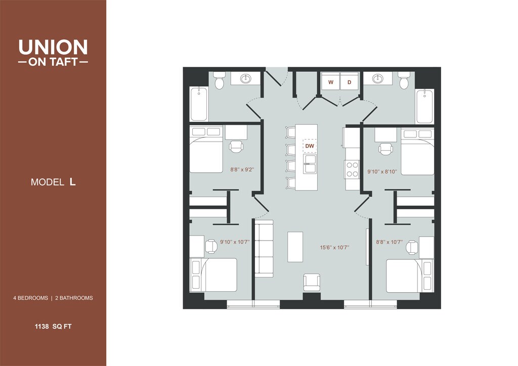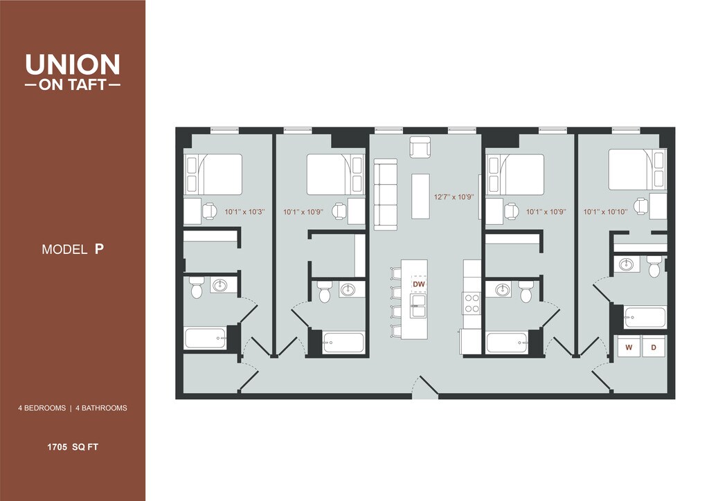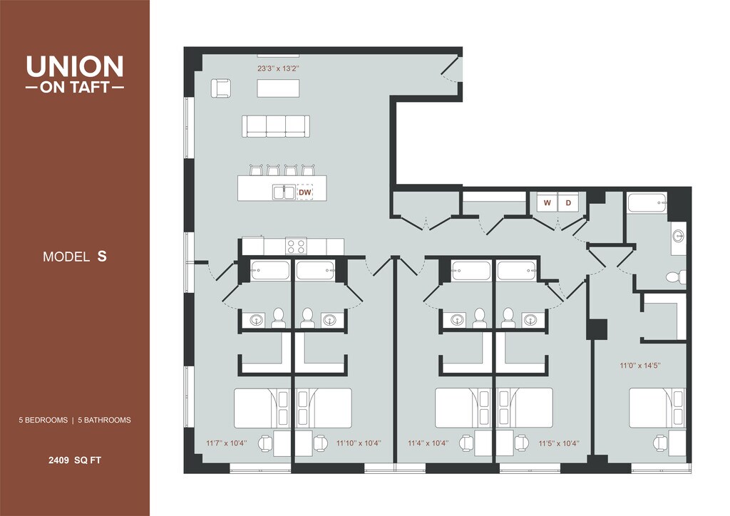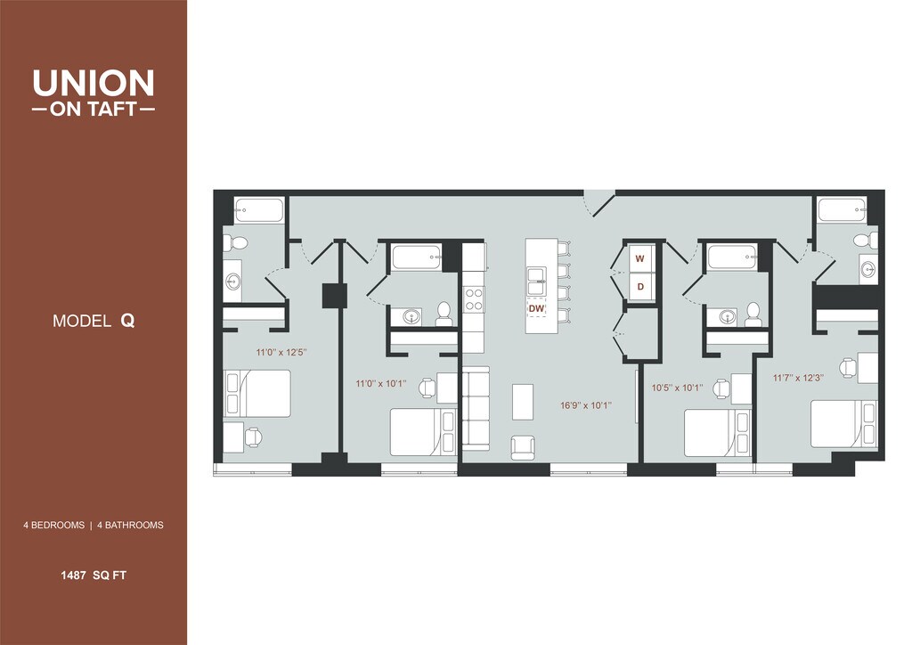 Live steps from campus at Union on Taft, modern student apartments near the University of Cincinnati. Choose from fully furnished studio, one, two, three, and four bedroom floor plans with private bedrooms, in-unit laundry, and stylish kitchens. Enjoy a 24-hour fitness center, private study rooms, a clubroom, and outdoor courtyards. Walk to class, coffee shops, and everything Clifton has to offer.