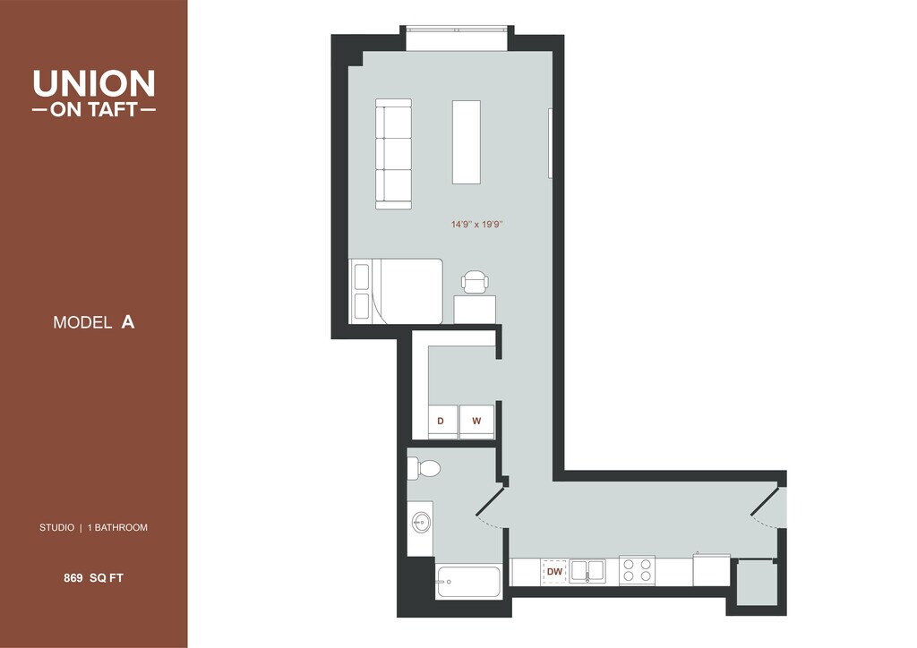 Modelo de apartamento: Studio Model A$1,250Estudio, 1 Baño, 869 sq ftDisponible August 15, 2026PlanosFotos![]()
